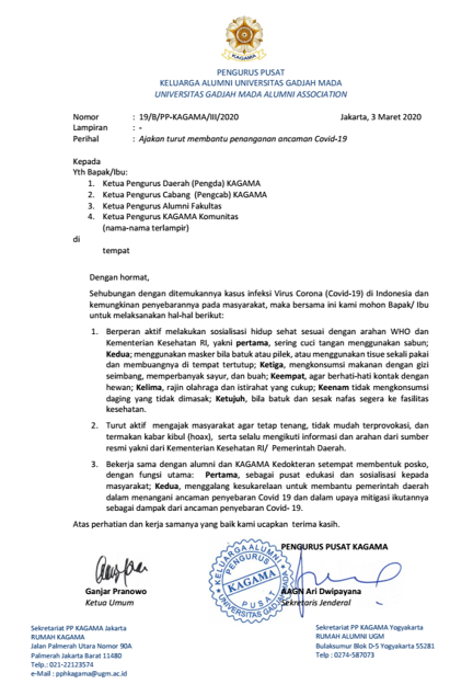 Jakarta, 3 Maret 2020. Presiden Joko Widodo beberapa hari yang lalu telah mengumumkan telah ditemukan kasus infeksi virus Corona di Indonesia. Untuk membantu penanganan ancaman Covid 19, Pengurus Pusat Kelaurga Alumni Universitas Gadjah Mada (Kagama) mengeluarkan ajakan Kepada Ketua Pengurus Daerah (Pengda), Ketua Pengurus Cabang (Pengcab), Ketua Pengurus Alumni Fakultas dan Ketua pengurus KAGAMA Komunitas untuk melakukan hal-hal antara lain: