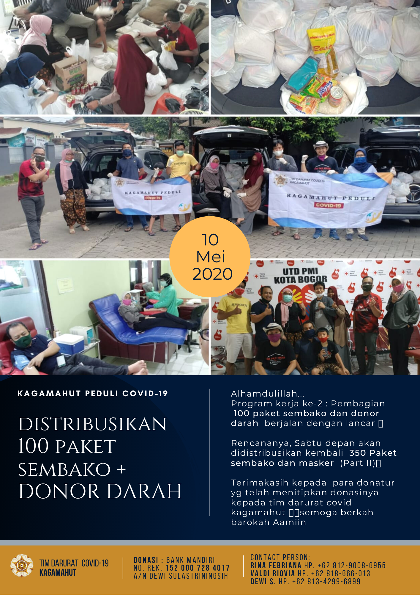 TIM DARURAT COVID-19 KAGAMHUT CONTACT PERSON: RINA FEBRIANA Hp. +62 812-9008-6955 VALDI RIOVIA HP. +62 818-666-013 DEWI SULASTRININGSIH. HP. +62 813-4299-6899 DONASI: BANK MANDIRI NO. REK. 152 000 728 4017 a/n DEWI SULASTRININGSIH